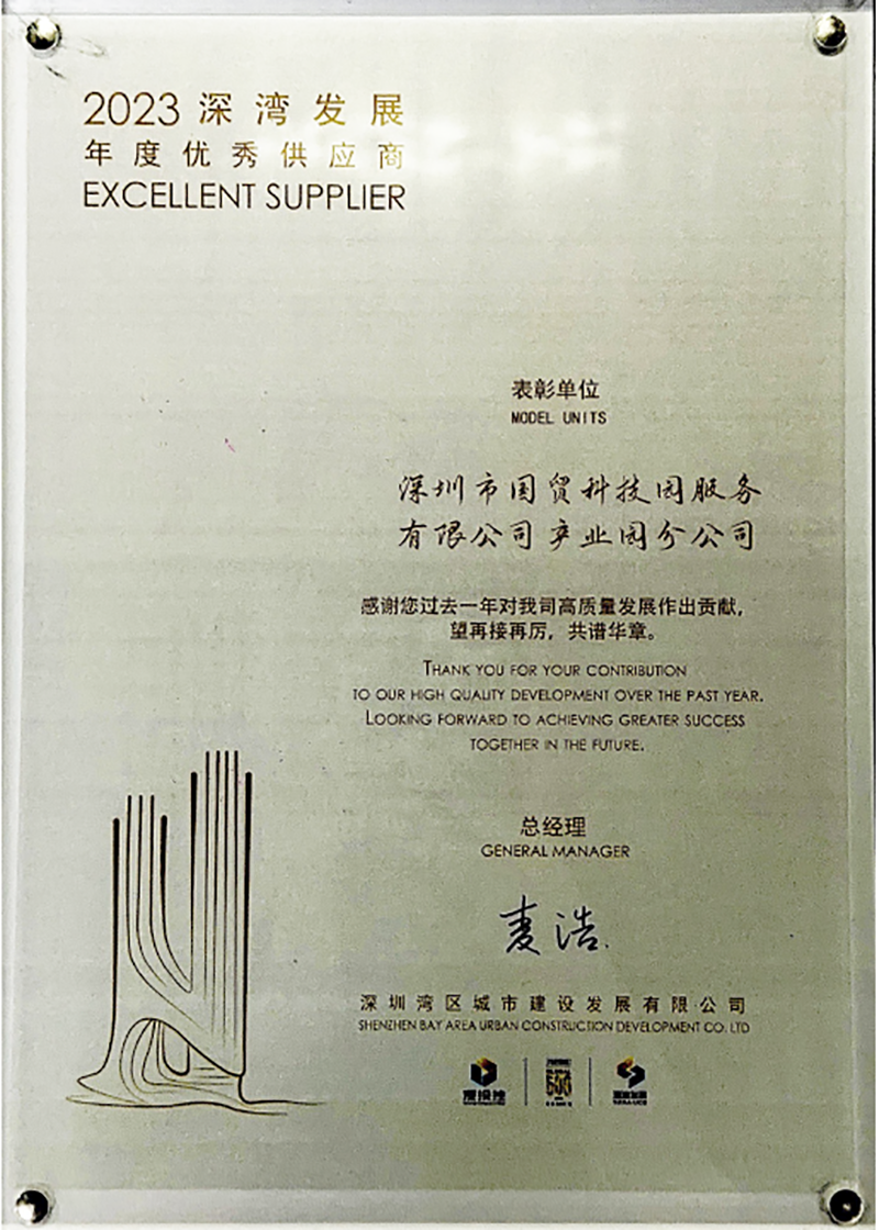 2024-07-10產業園分公司獲評“2023深灣發展年度優秀供應商”稱號近日,在深圳灣區城市建設發展有限公司年度供應商評選中,國貿科技園公司(產業園分公司)再次獲評“2023深灣發展年度優秀供應商”。